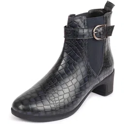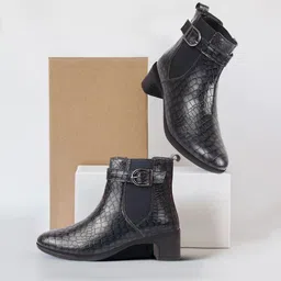 Flared Heel High Ankle Leopard Print Embossed Winter Buckle Strap Chelsea Boots For Women