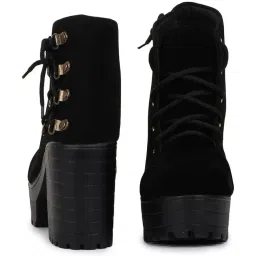 Women’s Stylish Black Block Heel Ankle Boots Winter | Trendy Lace-Up Velvet Boots for Girls & Ladies | Comfortable Chunky Platform Heel Boots for Casual & Party