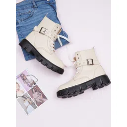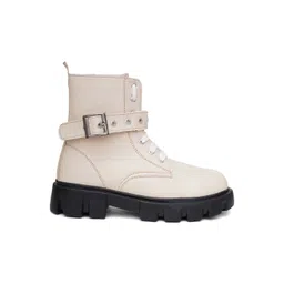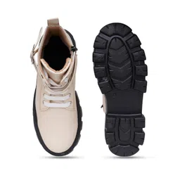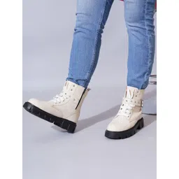 TRYME Cream & Black Solid Synthetic Leather Regular Boots